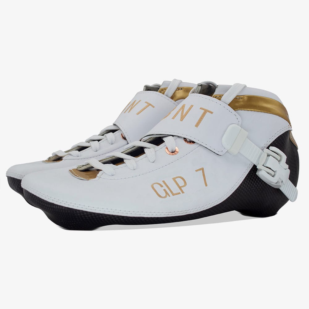 Le chausson utilise une peau extérieure en Durolite blanc mat avec des accents dorés brillants. Il porte le BNT brodé sur le couvre-lacet et le GLP 7 sur le côté du chausson avec le logo du cercle Bont à l'arrière.